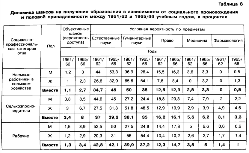 Однако неравенство шансов на поступление в университет лишь отчасти выражает социально обусловленное неравенство в получении образования. Таблица условных шансов показывает, что студенты и студентки с разным происхождением не распределяются равномерно по всем типам обучения. Если бы социальное происхождение или пол играл и роль дифференцирующего сита только в отношении доступа к высшему образованию; если бы, единожды поступив на факультет, неравным образом отобранные контингенты имели равные шансы направиться на разные специализации — короче, если бы распределение студентов по разным факультетам зависело лишь от «призвания» и индивидуальных «вкусов» (рассматриваемых как естественные склонности, неподвластные социальному детерминизму), то мы должны были бы на 100 студентов данного социального происхождения иметь распределение условных шансов, которое в каждой социальной категории просто отражало бы долю разных дисциплин в общей совокупности студентов. Так, в 1961/62 учебном году для гуманитарных наук они составляли бы 31,5%, для естественных наук — 32,4%, для прав а — 16,5%, для медицины — 15,6%, для фармацевтики — 4% , а в 1965/66 учебном году соответственно 34,4%, 31,4%, 19,9%, 10,7% и 3,5%. Однако эмпирически фиксируемое распределение представляет в сравнении со случайным распределением, вытекающим из «свободной игры природных способностей», систематическое отклонение, выражающееся в том, что, grosso modo, студенты, выходцы из обездоленных классов, направляются чаще на гуманитарные или естественно-научные факультеты, а студенты, выходцы из обеспеченных классов, — на юридические и медицинские факультеты. В самом деле, мы должны отметить, что между 1961/62 и 1965/66 учебным годом такая социальная специализация факультетов усилилась.