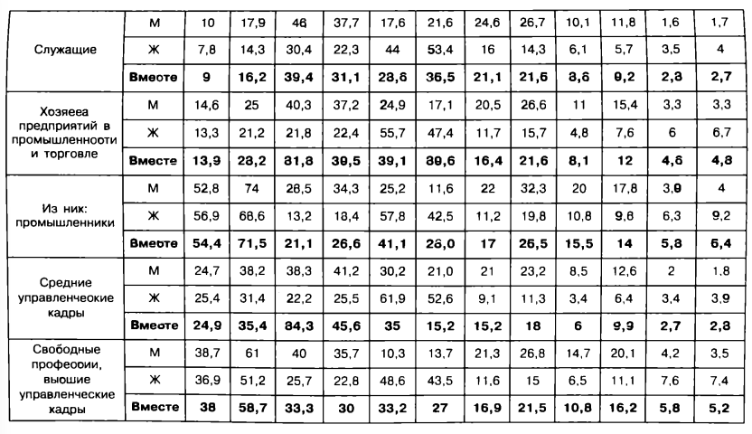 Так, вероятность получения высшего образования для сыновей промышленников выросла за этот период с 52,8 до 74%, т. е. только в 1,4 раза, однако, достигнув такой величины (74%), она находится теперь на таком уровне на шкале шансов, которому соответствует опыт практически полной уверенности в получении образования, а вместе с ней новые преимущества и новые противоречия, связанные с этим опытом. Если принять во внимание, с одной стороны, что значительное число детей промышленников получают образование в подготовительных классах для поступления в grandes écoles и в самих этих школах (т. е. не вошли в выборку, которая служила базой нашего статистического расчета) и, с другой стороны, что существует платное обучение, также не вошедшее в статистическую базу, которым пользуются в первую очередь именно представители данной социальной категории (псевдовузы коммерции, рекламы, журналистики, кино, фотографии и т. п.), — то мы должны предположить, что практически вся совокупность сыновей промышленников, способных посещать учебные заведения, действительно продолжает свое образование долгое время после достижения ими 18 лет. Так что теперь заметны первые признаки избытка образования в данной группе.