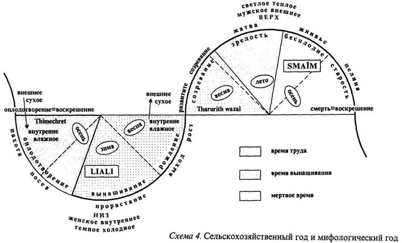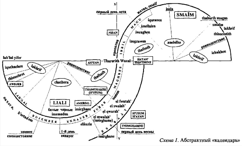 Так, слово «старухи», thimgharine, или thamghart, «старуха» (слова, отсылающие к легенде о днях, взятых взаймы, где рассказывается, как зима или январь, февраль и так далее, одолжив несколько дней у следующего периода, смогла наказать старую женщину по другим версиям, козу или чернокожего), которая бросила ей вызов), а также слово amerdil, «ссуда», обозначают либо момент перехода от одного месяца к другому от декабря к январю, от января к февралю, от февраля к марту и даже — в Айн Ахбэль — от марта к апрелю), либо момент перехода от зимы к весне. Н’usuт, учёное слово арабского происхождения, которое встречается в суре Корана, употребляется вместе с h’ayan (или ah’gan) для обозначения перехода отfurar к maghres. (Памятуя о том, что само объединение в [линейную] последовательность характеристик, зафиксированных в одном районе, представляет собой абсолютно искусственную операцию синтеза, мы включили в схему три основных последовательности: 1) imirghane, amerdil, thamghart, ah’gan или thiftirine, nisan; 2) thimgharine, ha’yan, nisan; 3) el mwalah’, el qwarah’, el swalah’, el fwatah’, h’usum, natah’, nisan, о которых весьма ориентировочно можно сказать, что они свойственны Кабилии в районе Джурджуры, малой Кабилии и, наконец, наиболее исламизированным районам, а также наиболее образованным информаторам.)
