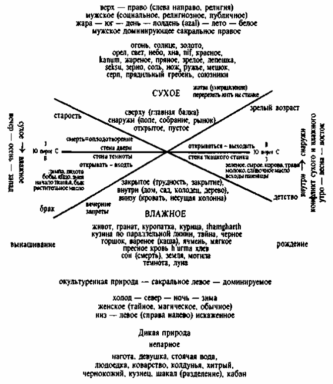 Смысл распределения видов деятельности между полами (такого, каким оно выглядит в приведённой ниже сводной таблице) можно постичь, комбинируя три основные оппозиции: оппозицию между движением внутрь (а также вниз) и движением вовне (или вверх), оппозицию между влажным и сухим и, наконец, оппозицию между непрерывными действиями, направленными на длительное поддержание противоположностей и распоряжение ими в их единстве, и краткими, прерывистыми действиями, направленными на объединение существующих противоположностей или разделение соединившихся. Нет нужды вновь возвращаться к оппозиции между внутренним, домом, кухней, или движением внутрь (накопление запасов) и внешним, полем, базаром, сходом, или движением вовне, между невидимым и видимым, личным и общественным и так далее. Оппозиция между влажным и сухим, которая частично перекрывает предыдущую, даёт женщине всё то, что имеет отношение к воде, зелени, траве, саду, овощам, молоку, дереву, камню, земле (женщина пропалывает огород босиком, она лепит глиняные горшки и внутренние стены голыми руками). Но последняя оппозиция, наиболее важная с точки зрения ритуальной логики, отделяет мужские действия: непродолжительные и опасные столкновения с пограничными силами (пахота, жатва, заклание быка), для которых требуются инструменты, сделанные с помощью огня, и соответствующие предохранительные ритуалы — от действий женских: от вынашивания и ведения хозяйства, постоянных забот, направленных на обеспечение непрерывности, приготовления пищи (аналогичного вынашиванию), ухода за детьми и животными (включающего чистку, уборку навоза, от запаха которого чахнут скотина и дети, а также подметание), тканья (которое в одном из его аспектов рассматривается как поддержание жизни), заготовки продуктов или просто сбора плодов, а также других видов деятельности, которые сопровождаются простыми искупительными обрядами. Сама женщина, то есть её жизнь и способность к деторождению, в высшей степени уязвима («беременная женщина стоит одной ногой в этом мире, а другой — в ином», «могила для неё остаётся открытой с момента зачатия до четвёртого дня после родов»), уязвимы также и те жизни, за которые она несёт ответственность, то есть жизнь детей, скота, сада. Выступая хранительницей объединённых противоположностей (то есть жизни), женщина должна распоряжаться жизнью и защищать её как техническими, так и магическими средствами.
