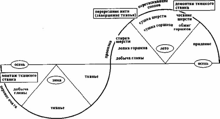 В случае тканья (см. схему 5), которое, как уже давно было отмечено (Basset, 1922, 154), представляет собой структуру, совершенно гомологичную (вплоть до её двусмысленности) структуре сельскохозяйственного цикла, но даже более прозрачную, поскольку она сводится к двум основным временным моментам: наладке ткацкого станка, связанной с открытием пахотных работ, и снятию сотканного материала со станка, связанного с жатвой, — аксиома, управляющая всей логикой жертвоприношения, обозначена почти явным образом.