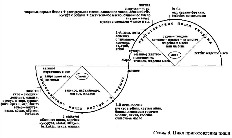 На примере тканья хорошо видно, что использование практически взаимозаменяемых схем лежит в основе выявляемых анализом гомологии между различными сферами практики. Так, например, чтобы понять в общих чертах чередование обычных или необычных блюд, которые в зависимости от назначения миметических ритуалов, посвящённых употреблению пищи [50], связаны с разными периодами сельскохозяйственного года (см. схему 6), достаточно выявить оппозицию между двумя классами продуктов питания и двумя классами операций: с одной стороны, это сухие продукты, крупы (пшеница и овёс), сухие овощи (бобы, турецкий горох, горошек, чечевица и так далее) или сушёное мясо, которое внутри дома [(а не во дворе)] варят в воде, без специй, в горшке, а также то, что готовится на пару или на опаре (оладьи), при том что общей чертой всех этих операций является набухание; а с другой стороны, сырые продукты, зелёные, свежие (таков смысл слова azegzaw, «связанный с весной и зеленеющими всходами»), которые едят сырыми (чаще весной) и/или жареными и печеными на блюде (bufrah ’), вне дома, обильно приправленными специями [51]. Для полного понимания всех наблюдаемых вариантов достаточно отметить, кроме всего прочего, что первая комбинация характерна для конца осени и зимы, этого периода увлажнения сухого и ожидания момента, когда земля и женщина набухнут, а вторая комбинация ассоциируется с весной, этим переходным периодом, и с летом, временем иссушения влажного и разрыва с женским, когда всё, что развивалось внутри, как, например, бобовые или пшеничные зёрна, должно открыться и выйти наружу для созревания.