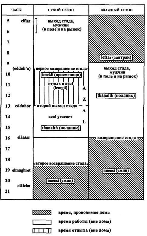 Структура дня (которая самым естественным образом сообразуется с пятью мусульманскими молитвами) представляет собой другой, с лёгкостью считываемый продукт применения тех же принципов. Во влажный сезон день сохраняет ночные свойства даже в своей светлой части. По причине того, что в это время стадо выходит и возвращается лишь один раз, такой день предстаёт как незавершённая форма дня сухого сезона (см. схему 7). С наступлением дня, называемого «возвращение azal», который означает рубеж сухого сезона, когда хозяйка выносит огонь во двор, происходит резкий переход к более сложному ритму дня, в течение которого стадо выгоняют и возвращают дважды. Первый раз стадо выходит на заре и возвращается с наступлением жары, то есть приблизительно в doh’a, второй выход совпадает с молитвой середины дня, dohor, a возвращение — с наступлением ночи.