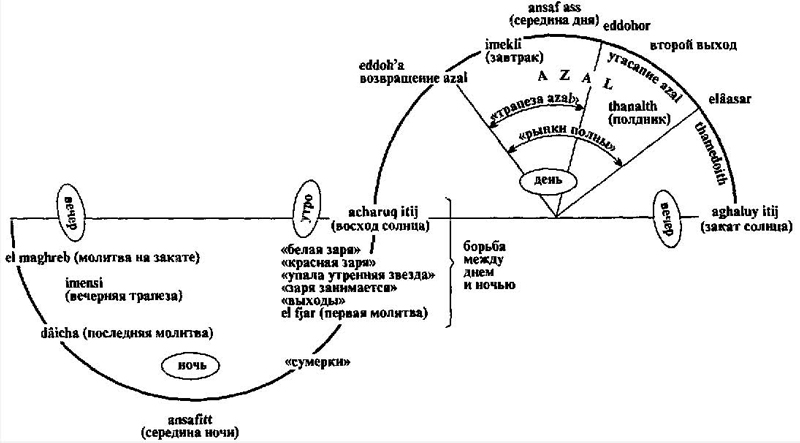 Точно так же, как год движется от осени к лету, направляясь с запада на восток, день (as) движется от вечера к полудню: вечерняя трапеза (imensi) — это первый и основной приём пищи за день. Хотя система организована в соответствии с замкнутым циклом вечного возврата, где вечер и осень, старость и смерть являются также местом зачатия и посевов, время ориентировано на кульминационную точку, которую представляет собой полдень, лето или зрелый возраст (см. схему 8). Ночь в своей самой тёмной части, так называемая «тьма середины ночи», которая объединяет мужчин, женщин и детей в наиболее глубоко спрятанной части дома, рядом с животными, в замкнутом, влажном и холодном месте сексуальных отношений, ассоциирующемся с могилой и смертью, противопоставляется дню, а точнее, тому, что является его кульминацией, azal, моментом, когда свет и жара стоящего в зените солнца достигают наибольшей силы. Связь между ночью и смертью, которая напоминает о себе ночными шумами, воем собак и шакалов, зубным скрежетом спящих, похожим на скрежет умирающих, находит своё отражение во всех вечерних запретах: запрещается купаться или просто бродить вдоль воды, особенно стоячей, чёрной, илистой, зловонной, смотреться в зеркало, смазывать маслом волосы, дотрагиваться до золы. Осуществление всех этих запрещённых практик может усилить пагубное воздействие ночной темноты через её контакт с веществами, обладающими теми же свойствами (и в некоторых случаях почти взаимозаменяемыми: волосы, зеркало, чёрная вода).