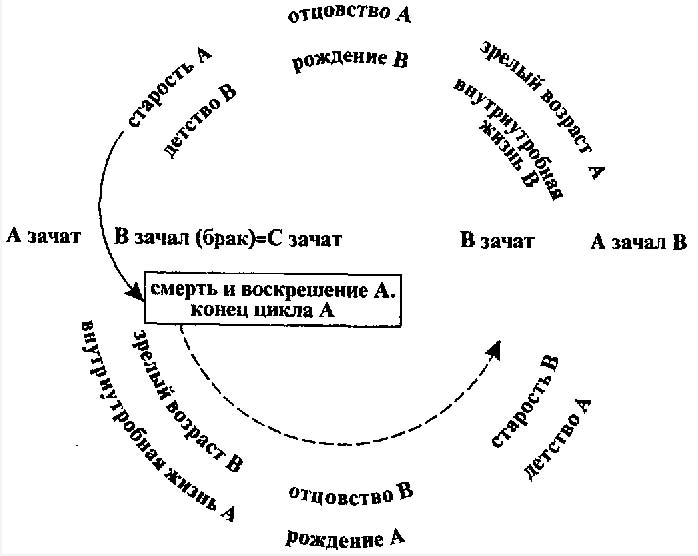 В таком цикле разные поколения занимают различные позиции: диаметрально противоположные — поколения, следующие одно за другим, отцы и сыновья (поскольку первые зачинают вторых и вступают в старость, когда те ещё пребывают в детстве), одинаковые же позиции занимают поколения, следующие через одно — деды и внуки (см. схему 9). Такова логика, которая, превращая рождение в возрождение, подводит отца к тому, чтобы называть своего первого сына, когда это возможно, именем своего отца («называть», asker, означает «воскрешать»). В отношении поля действует совершенно гомологичный цикл двухпольного севооборота: как цикл поколения завершается смертью и воскрешением А (то есть когда В зачинает С), цикл поля завершается, когда поле А, которое остаётся в невозделанном виде, ожидая своего воскрешения в течение всего времени, пока длилась жизнь вспаханного поля, «воскрешается» пахотой и севом, то есть в момент, когда поле В возвращается к своему необработанному состоянию. Мы видим, как опровержение умерщвления посредством введения цикла стремится поглотить саму «природную» смерть. Вопреки научной иллюзии ожидание «воскрешения» мёртвых есть лишь продукт переноса сложившихся схем в практику, самым непосредственным образом обращённую к удовлетворению мирских потребностей.