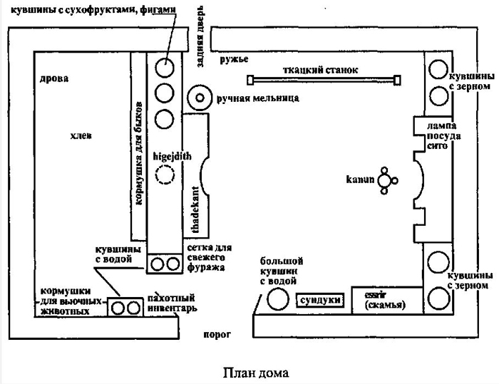 Отсюда понятным становится значение, которое придаётся расположению дома: фасад главного дома, где живёт хозяин и где расположен хлев, почти всегда ориентирован на восток, главная дверь — в противовес узкой и низкой двери, предназначенной для женщин и выходящей в огород позади дома, — обычно называется «дверь на восток» (thabburth thacherqith) или «дверь на улицу», «верхняя дверь» или «большая дверь» [15]. При обычном размещении в деревне и с учётом меньшей высоты хлева высокая часть дома с очагом выходит на север, хлев — на юг, а стена ткацкого станка — на запад, откуда вытекает, что движение в сторону входа в дом ориентировано с востока на запад, в противоположность движению в сторону выхода из дома, соответствующему в чистом виде ориентации на восток, то есть наверх, к свету, к доброму, благому. Так, когда пахарь запрягает или распрягает волов, он поворачивает их на восток и пахать начинает с запада на восток.
