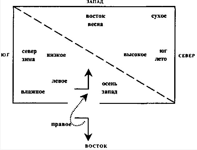 Таким образом, оппозиция между домом женщин и собранием мужчин, между частной жизнью и жизнью публичной или, если угодно, между ярким светом дня и тайной ночи очень точно накладывается на оппозицию между низкой, тёмной и ночной частью дома и его высокой, благородной и ярко освещённой частью [8]. Иначе говоря, оппозиция, которая устанавливается между внешним миром и домом, полностью обнаруживает свой смысл только в том случае, если принимать во внимание, что сам дом, как один из членов этой оппозиции, оказывается разделён по тем же основаниям, по которым он противопоставлен другому члену. Поэтому в равной мере верно и неверно говорить, что внешний мир противопоставляется дому, как мужское — женскому, день — ночи, огонь — воде и так далее, поскольку второй член этих оппозиций каждый раз делится на самое себя и на свою противоположность.