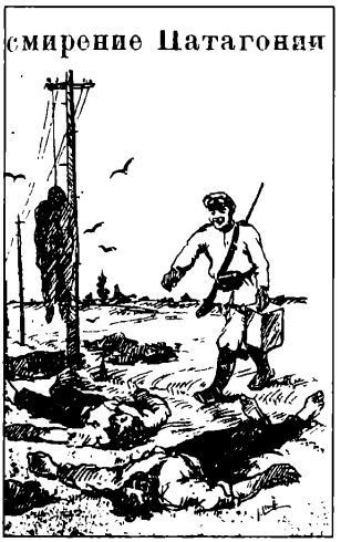 Противостояние возобновилось, когда помещики, в нарушение соглашений, отказались выплатить зарплату за март 1921 г. 23 октября полиция арестовала и выслала активистов рабочего союза. Через неделю забастовка возобновилась. Организованные группы пеонов ходили от поместья к поместью, призывали трудящихся объединиться, конфисковали продовольствие, перерезали телефонные ли- смирение Патагонаи нии (на станции Тэуэльче). В первых рядах движения шли аргентинцы, испанцы и чилийцы Рамон Оторельо, Антонио Сото, Аргуэльес, Аренас, Эсубьере. Вильяфанье, Пинтос и МануэльЛейва и бывший немецкий лейтенант, ставший анархистом. Участникам движения удалось занять такие населенные пункты, как Пасо- Ибаньес с 1500 жителями, Канада-Леон и др. В ноябре власти вернули в район военные части. Правительственные силы численностью 10 полков включали кавалерию и военные суда, обстрелявшие один из городов, захваченных рабочими. Не обнаружив взбунтовавшихся пеонов в населенных пунктах, войска стали охотиться на них в открытом поле, как на диких зверей. В Пунта-Альта они окружили бунтарей и расстреляли их издалека. В Анита потребовали, чтобы те сложили оружие, после чего расстреляли 250 человек, отказавшихся выдать «зачинщиков». Других раздевали догола, привязывали на ночь колючей проволокой, а затем обливали горючим и сжигали живьем. Власти и помещики обвинили работников в «бандитизме», и им пришлось защищаться с помощью примитивного оружия. Под станцией Тэуэльче они во главе с каретником Хосе Фонтом вступили в бой с войсками. На одноименном предприятии владелец распорядился расстрелять 27 рабочих — по одному за каждую из потерянных им лошадей.