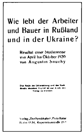 Однако в 1920 г. возможность практического взаимодействия еще допускалась. По приглашению советской стороны революционные профсоюзные организации различных стран направили своих представителей на 11 конгресс Коминтерна в Москве летом 1920 г. ФАУД уполномочил своих направляемых в Россию делегатов австралийца Пола Фримена и немца Аугустина Сухи «изучить экономическую Советскую систему в России, чтобы мы смогли прийти к ясности на сей счет и оценить в нашей стране опыт российских товарищей» [14]. П. Фримен стал позднее сторонником большевизма, А. Сухи вернулся из Москвы его пламенным противником. Свои впечатления от Российской революции он описал в изданной вскоре книге. Подвергнув резкой критике большевистские методы завоевания политической власти, централизма и диктаторского государственного социализма, немецкий синдикалист сделал рекомендацию: это урок, «как не следует действовать, если в собственной стране начинается революция» [15].