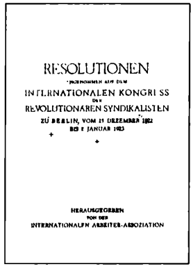 Была принята Декларация принципов, в основу которой легла соответствующая декларация ФАУД. В ней отвергались политические партии, парламентаризм, милитаризм, национализм и централизм. Провозглашались полная автономия экономических организаций трудящихся физического и умственного труда, прямое действие, курс на всеобщую стачку как его высшее выражение и «прелюдию к социальной революции», цель федералистского персустройства экономической и социальной жизни, ликвидации всех государственных функций в жизни общества и создания строя либертарного коммунизма. Решительно осуждались диктатура пролетариата и большевистские методы [37]. По словам исследователя У. Торпа, декларация «обозначила важный сдвиг в синдикалистском мышлении, поскольку закрепила и сделала явным то, что часто лишь подразумевалось в довоенном европейском синдикализме». Ведь она сформулиров,иа «нс просто политическую нейтральность, выраженную в ”Амьенской хартии”, но оппозицию по отношению ко всем политическим партиям, которые рассматривались ныне как отличные, враждебные организации, неминуемо стремящиеся к установлению контроля над профсоюзами или к их подчинению, а также разрушение политического государства... Короче говоря, документ, принятый делегатами в Берлине, выработал анархо-синдикалистские принципы» [38].