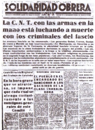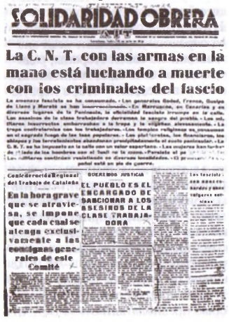 Комитеты НКТ и ФАИ выпустили манифест «К рабочим мас сам и антифашистам всего мира», в котором ничего не говорилось о социальной революции, а только о борьбе против фашизма. В обращении подчеркивалось, что не трудящиеся первые взялись за оружие, что они лишь ответили на фашистский мятеж. «Посред ством героического вмешательства НКТ и ФАИ, которым помог ли трудящиеся, все трудящиеся всех тенденций, военный мятеж в Каталонии был подавлен. Впервые в истории мира рабочий народ одной из стран сумел победить военные силы своей собственной нации, которые хотели навязать себя ему в качестве самодержцев. Эта победа открывает новую эру в истории современного мира», — заявляли комитеты НКТ и ФАИ. Анархо-синдикалистекие руково дители категорически опровергли слухи и сообщения о грабежах и насилии в Барселоне и заверяли, что ни один иностранец не пост радал и безопасность иностранных граждан будет обеспечена. От метив, что борьба не окончена, они обратились ко всем «свободо мыслящим людям» с просьбой о «моральной помощи»: «Наша борьба — это ваша борьба. Наше поражение усилит фашизм в мире. Наша победа, напротив, будет победой Свободы над международ ным фашизмом. Это будет также победой прогресса над варвар ством... Помогите нам в борьбе против фашизма!»37