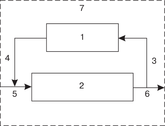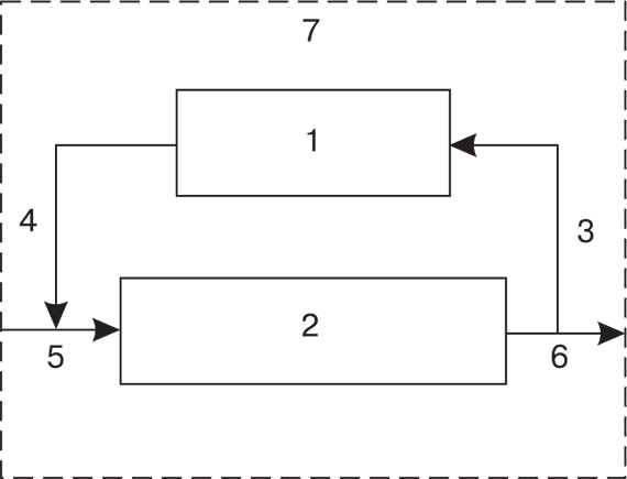 Рис. 2.1. Схема системы управления с обратной связью: 1 – управляющая система; 2 – управляемая система; 3 – канал передачи информации о состоянии; 4 – канал передачи управляющих воздействий; 5 – воздействие среды на объект управления; 6 – выход объекта управления; 7 – внешняя среда