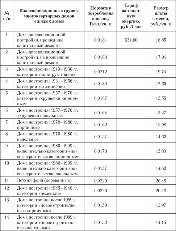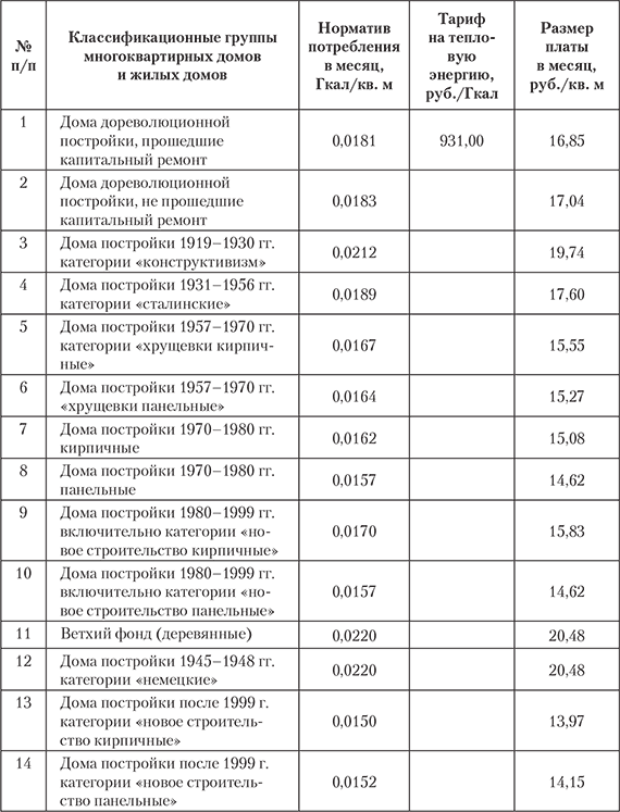 Размер платы за отопление (табл. 3.3) представляет особый интерес. Он дифференцирован по 14 группам домов, характерных для города и имеющих различные нормативы потребления тепловой энергии в зависимости от теплопроводности конструкции здания.