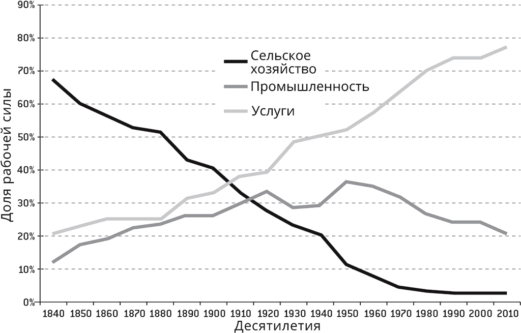 Рисунок 2. Распределение рабочей силы по секторам в США, 1840–2010-е годы
