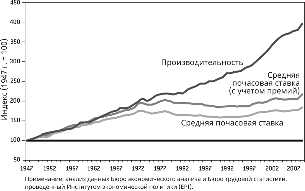Вообще говоря, дополнительных менеджеров нанимают под предлогом повышения эффективности. Но в этом случае улучшать было практически нечего: рабочие сами повысили эффективность настолько, насколько это вообще возможно. Но менеджеров всё равно наняли. Это показывает, что мы имеем здесь дело никак не с эффективностью, а с изменением представлений о моральной ответственности корпораций. Примерно с 1945 по 1975 год существовала так называемая кейнсианская сделка между рабочими, работодателями и государством. В рамках этих негласных правил считалось, что повышение производительности рабочих должно сопровождаться реальным увеличением их вознаграждения. График на следующей странице подтверждает, что именно это и происходило. В 1970-е эти два показателя начали расходиться: вознаграждение практически вышло на плато, а производительность устремилась вверх, как ракета (см. рисунок 5).