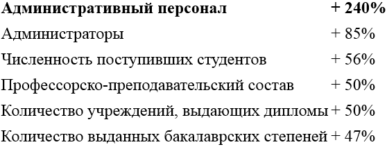Таблица 2. Рост числа администраторов в государственных и частных университетах с 1975 по 2005 год