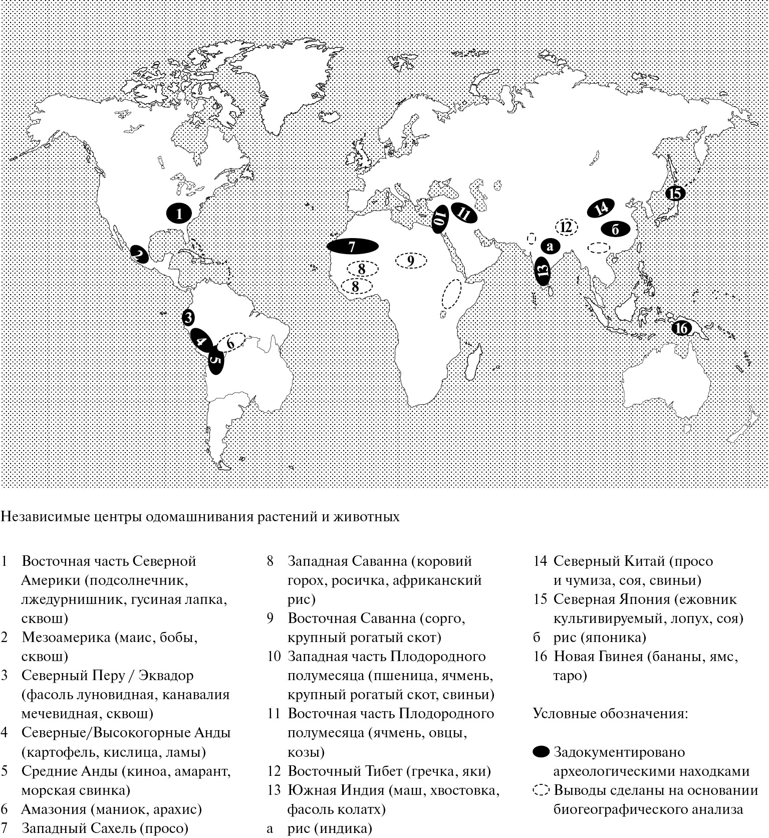 Археологическая наука показывает, что это не так. Сегодня эксперты выделяют от 15 до 20 независимых центров одомашнивания, многие из которых развивались совсем не так, как аналогичные центры в Китае, Перу, Мезоамерике или Месопотамии (которые тоже развивались по-разному, как мы увидим в следующих главах). Среди древних центров сельского хозяйства также следует назвать Индийский субконтинент (где были одомашнены хвостовка, маш, рис индика и зебу, разновидность крупного рогатого скота); луга Западной Африки (просо); центральное высокогорье Новой Гвинеи (бананы, таро и ямс); тропические леса Южной Америки (маниок и арахис); и Восточный Вудленд в Северной Америке, жители которого выращивали различные семенные культуры местного происхождения (гусиную лапку, подсолнечник и лжедурнишник) задолго до того, как к ним из Мезоамерики пришел маис[362].