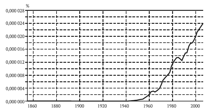 Взять, к примеру, следующий график (рис. 1), показывающий, как часто слово «бюрократия» употреблялось в книгах, написанных на английском языке за последние полтора столетия. Интерес к этому явлению был весьма ограниченным до конца Второй мировой, затем резко усилился в 1950-е годы и, достигнув пика в 1973 году, стал медленно, но верно ослабевать.