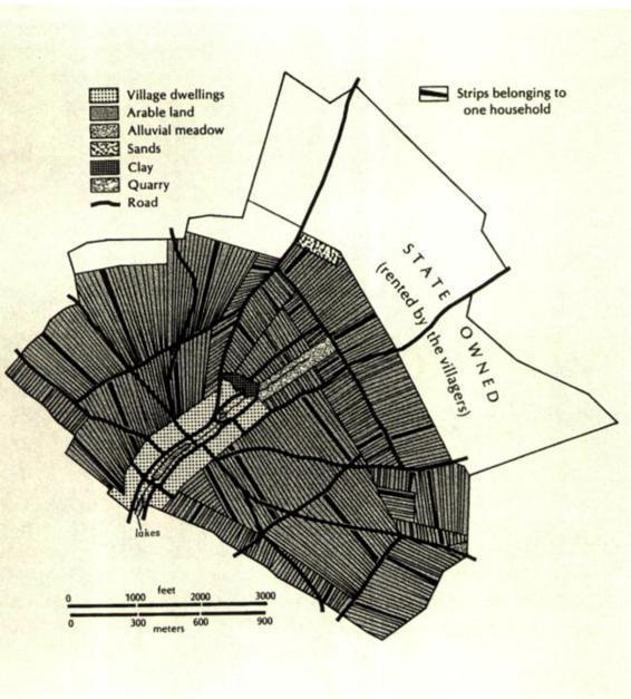 Деревня Новоселок пользовалась различными способами возделывания земли, ведения животноводства и лесоводства, а деревня Хотиница была ограничена в обработке земли и животноводстве (рис. З и 4). Сложная путаница наделов должна была гарантировать, что все деревенские хозяйства получат полосу земли в каждой экологической зоне. Индивидуальное хозяйство могло иметь 10—15 различных участков, дающих некоторое представление об экологических зонах и микроклимате деревни. Распределение разумно подстраховывало семью от риска, а земля время от времени перераспределялась, поскольку состав семей уменьшался или увеличивался[84].